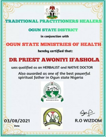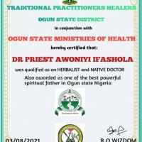 I am.chief Awoniyi Ifashola from the Herbalist Associoation of Nigeria (HAN) registered and approved by the federal Government of Nigeria. When you burry your doubt and trust your faith, I CAN MAKE YOU RICH WITHOUT HUMAN SACRIFICE. Distance is not a barrier to my spiritual miracles and manifestation. I HELP WITHOUT DISCRIMINATION OF TRIBE COUNTRY OR RELIGION.