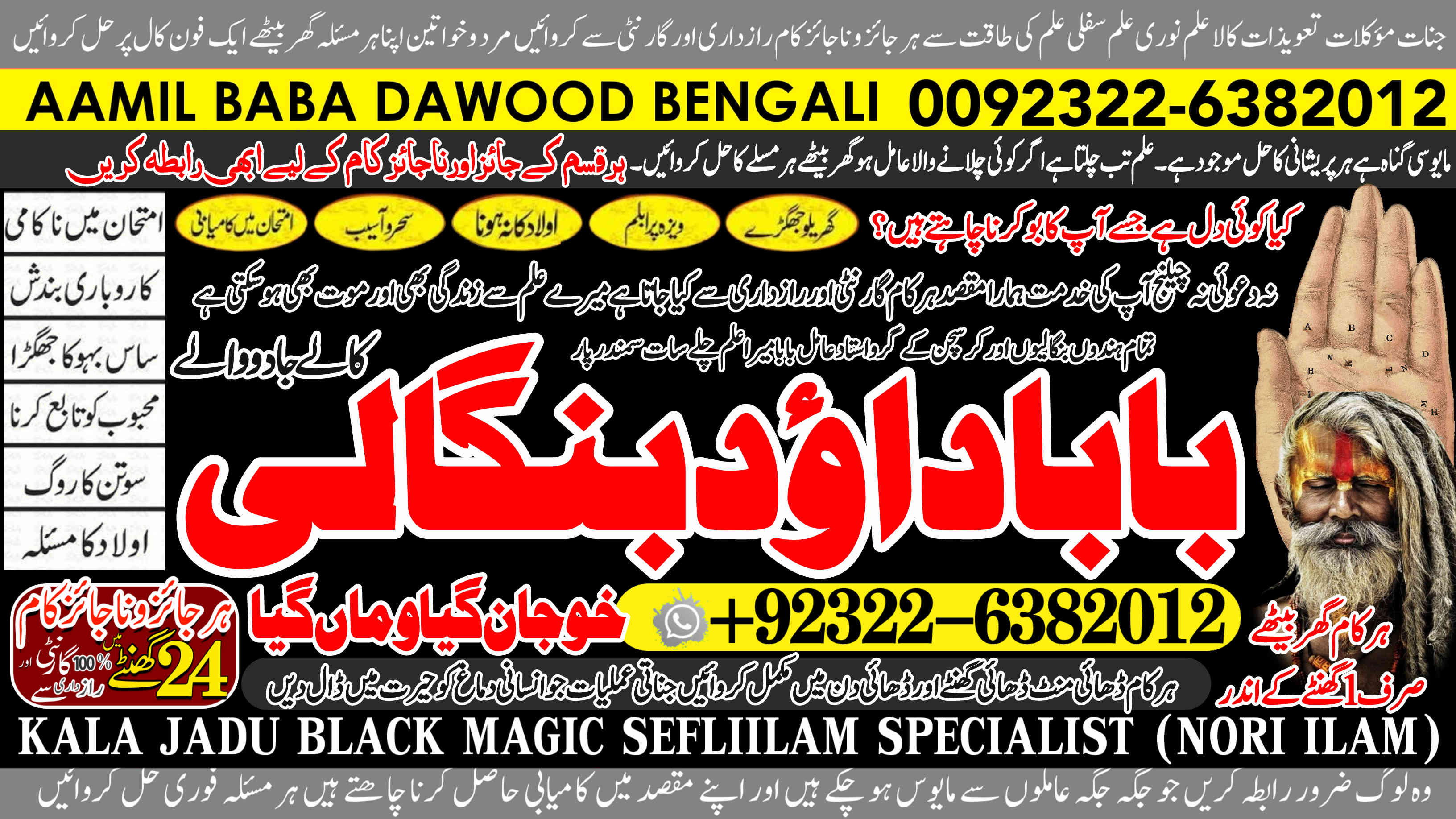 Amil Baba Dawood Bangali { PAK: 0322-6382012 ---- UAN: 0092-322-6382012} is a renowned spiritual healer and master of ancient occult sciences, specializing in Black Magic, Sephi Ilam, Nori Ilam, and Voodoo Spells. With decades of experience in the mystical arts, he has gained a reputation as a powerful and trusted guide for those seeking solutions to life's most challenging problems.