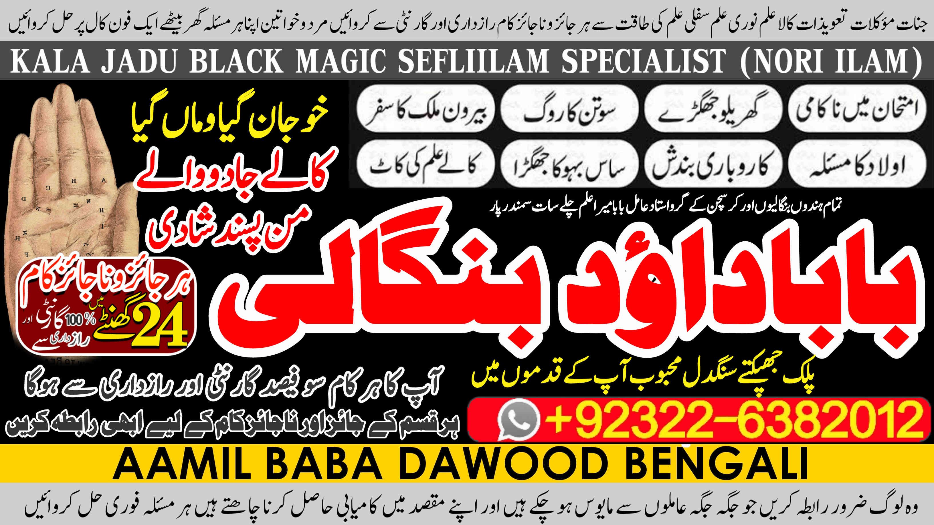 Amil Baba Dawood Bangali { PAK: 0322-6382012 ---- UAN: 0092-322-6382012} is a renowned spiritual healer and master of ancient occult sciences, specializing in Black Magic, Sephi Ilam, Nori Ilam, and Voodoo Spells. With decades of experience in the mystical arts, he has gained a reputation as a powerful and trusted guide for those seeking solutions to life's most challenging problems.