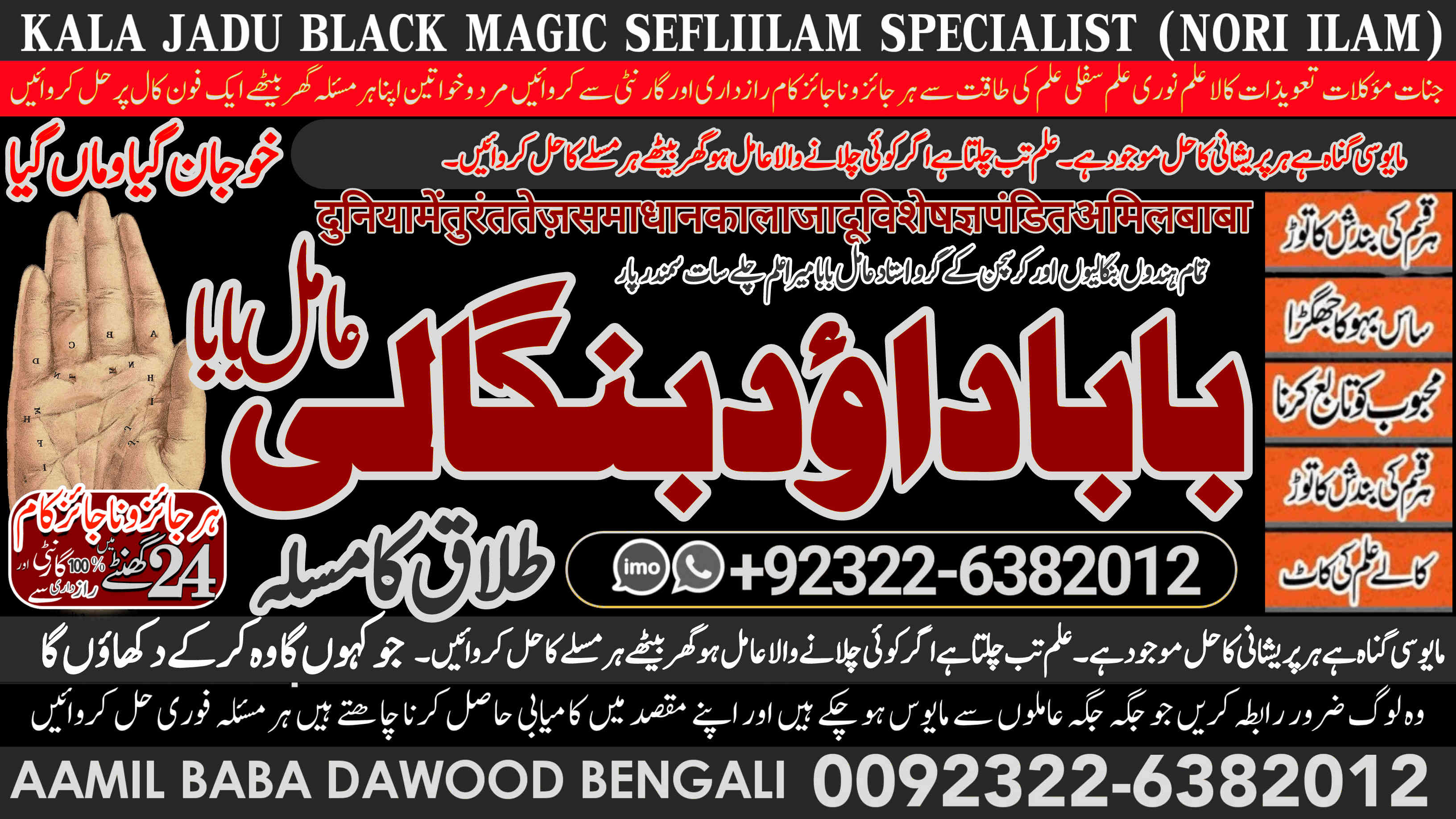 Amil Baba Dawood Bangali { PAK: 0322-6382012 ---- UAN: 0092-322-6382012} is a renowned spiritual healer and master of ancient occult sciences, specializing in Black Magic, Sephi Ilam, Nori Ilam, and Voodoo Spells. With decades of experience in the mystical arts, he has gained a reputation as a powerful and trusted guide for those seeking solutions to life's most challenging problems.
