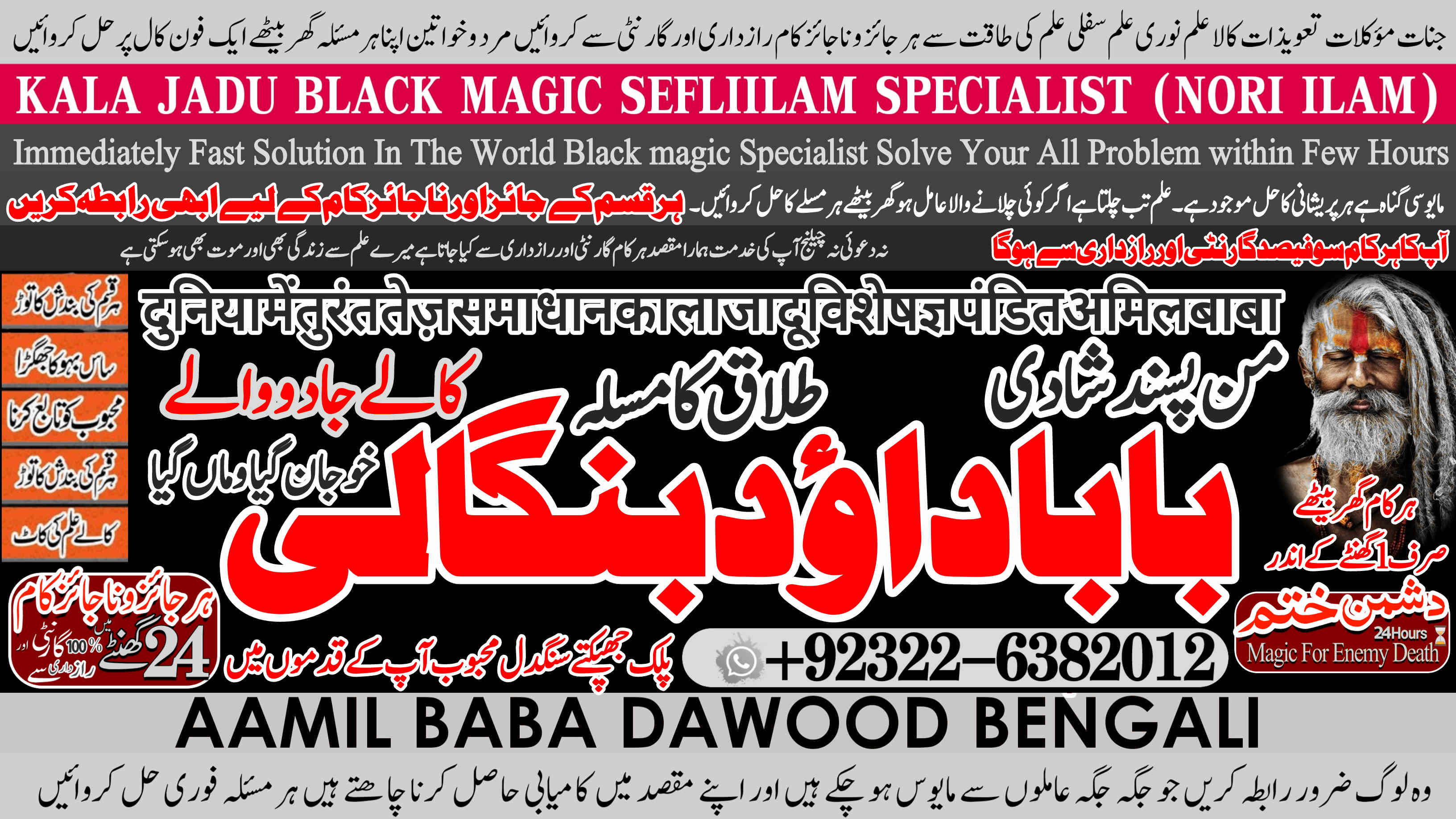 Whether it's love and relationship issues, business success, enemy protection, enemy dead or supernatural disturbances, Amil Baba Dawood Bangali provides authentic and effective remedies rooted in deep spiritual knowledge. His expertise in Kala Jadu (Black Magic), Sephi Ilam (sacred scriptures), Nori Ilam (divine light magic), and Voodoo rituals ha