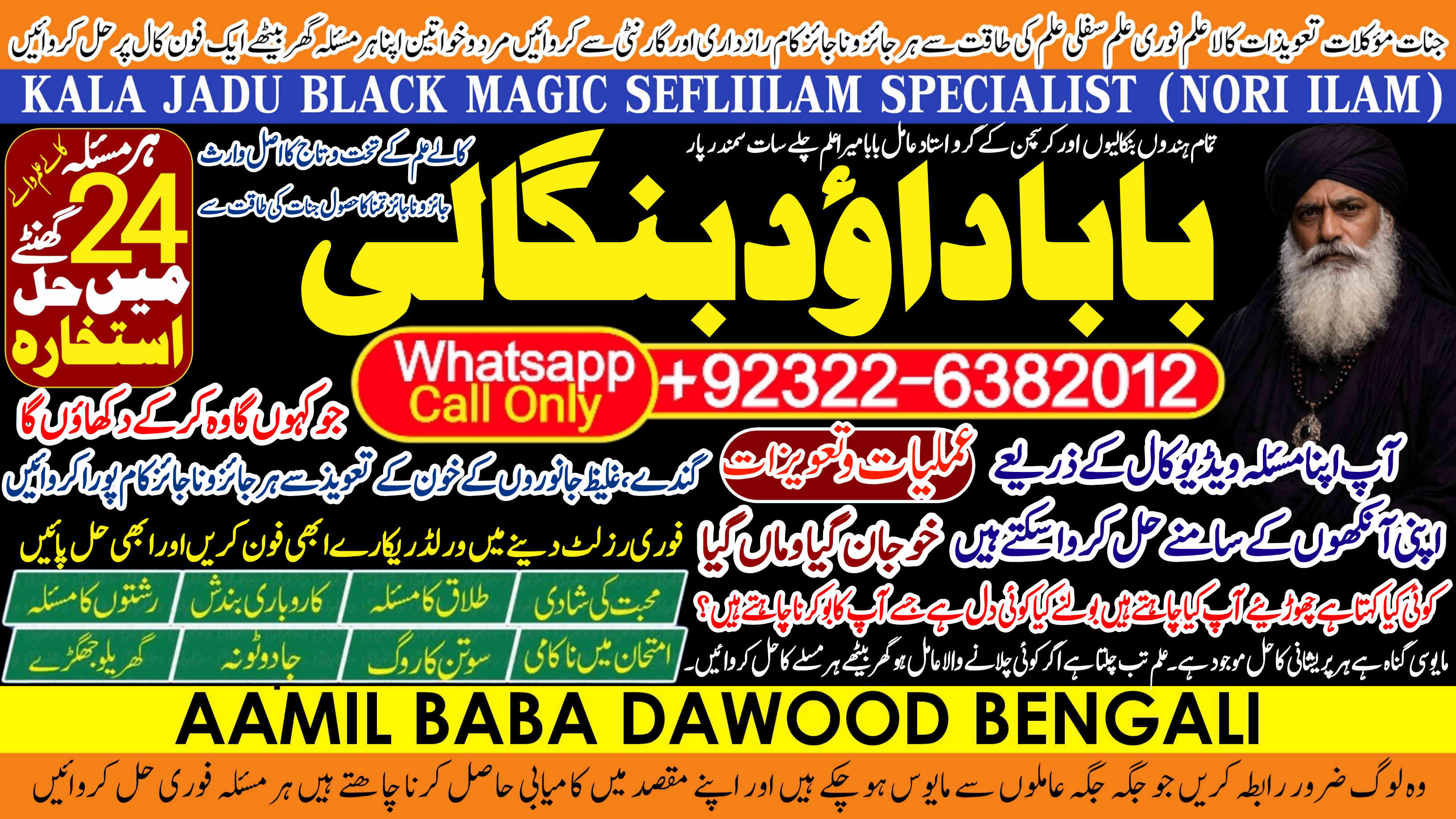 Amil Baba Dawood Bangali Contact on whatsapp +92322-6382012 is a renowned spiritual healer and master of ancient occult sciences, specializing in Black Magic, Sephi Ilam, Nori Ilam, and Voodoo Spells. With decades of experience in the mystical arts, he has gained a reputation as a powerful and trusted guide for those seeking solutions to life's most challenging problems.