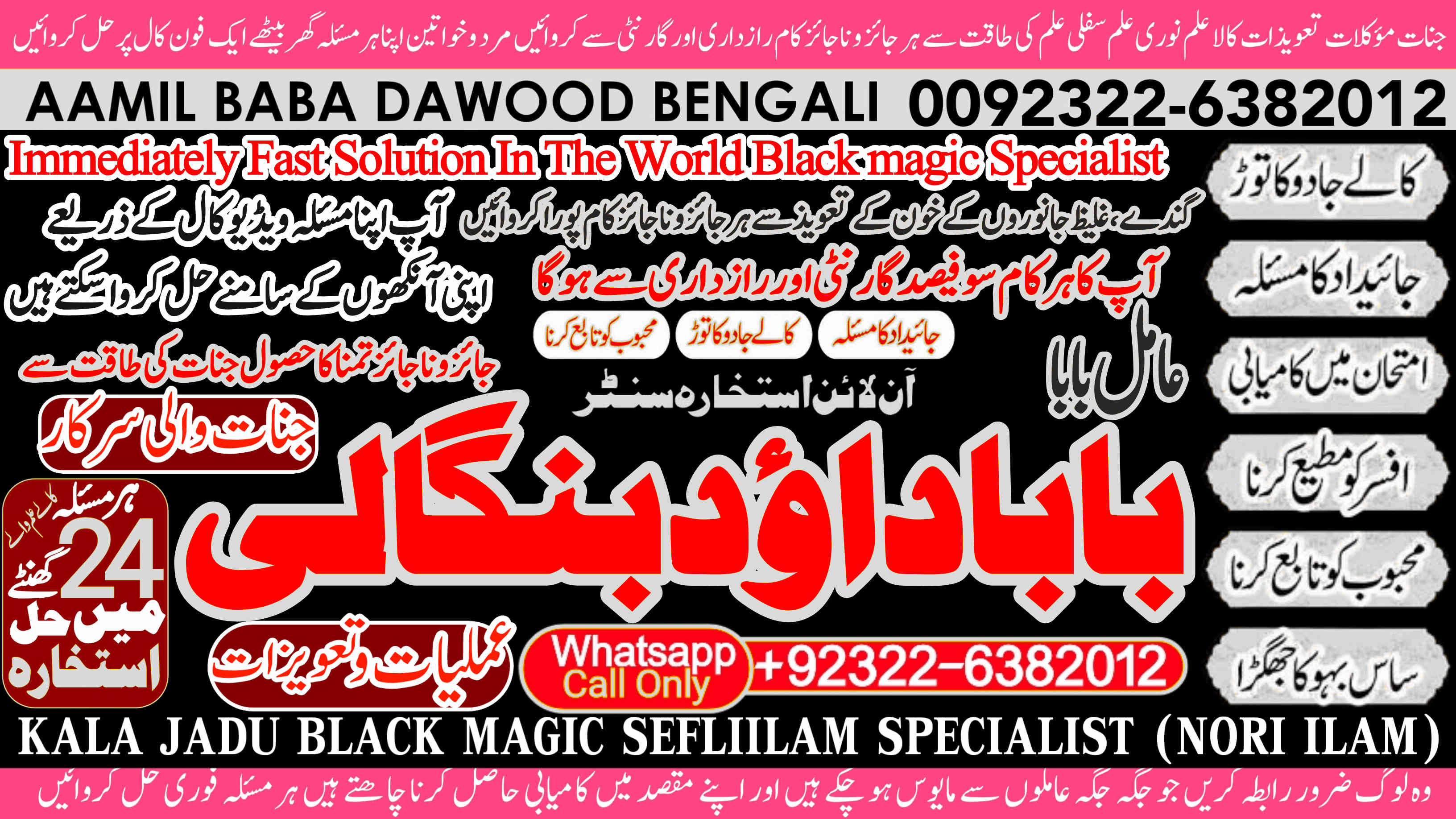 Amil Baba Dawood Bangali Contact on whatsapp +92322-6382012 is a renowned spiritual healer and master of ancient occult sciences, specializing in Black Magic, Sephi Ilam, Nori Ilam, and Voodoo Spells. With decades of experience in the mystical arts, he has gained a reputation as a powerful and trusted guide for those seeking solutions to life's most challenging problems.