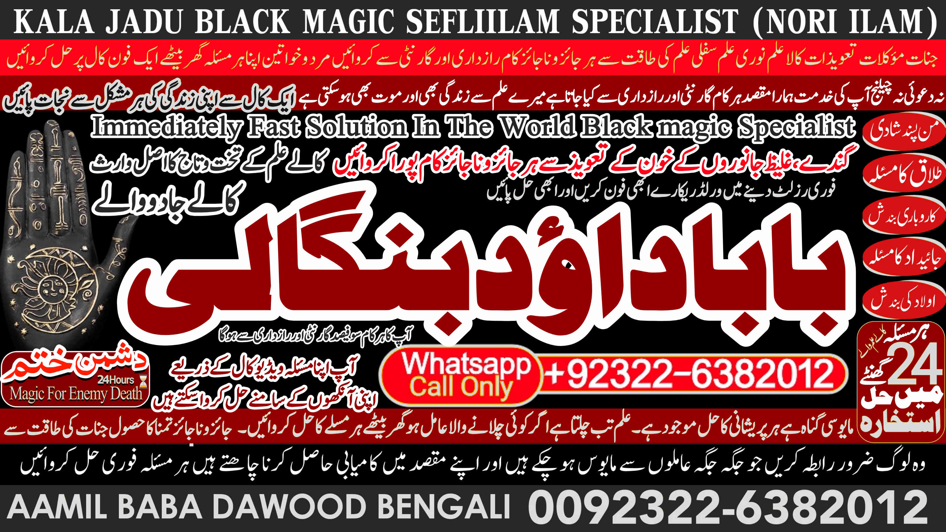 Whether it's love and relationship issues, business success, enemy protection, enemy dead or supernatural disturbances, Amil Baba Dawood Bangali provides authentic and effective remedies rooted in deep spiritual knowledge. His expertise in Kala Jadu (Black Magic), Sephi Ilam (sacred scriptures), Nori Ilam (divine light magic), and Voodoo rituals has helped countl