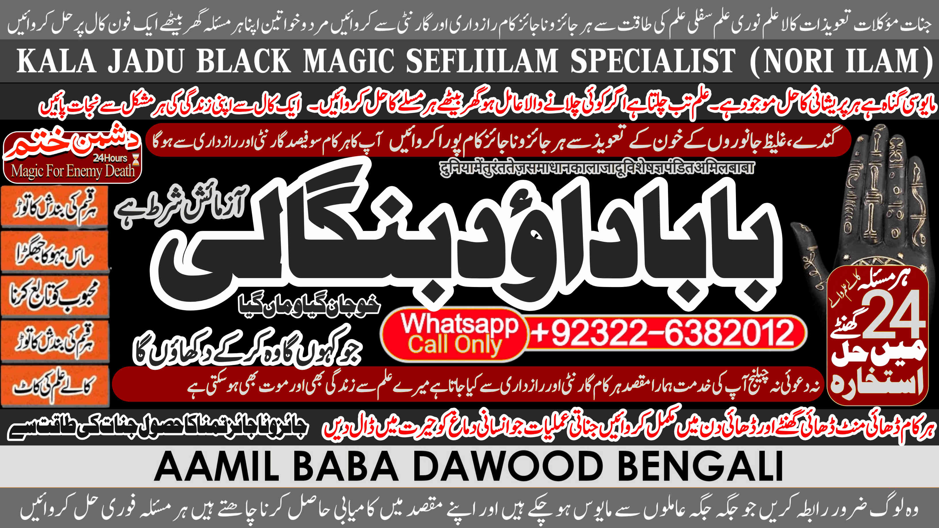 Whether it's love and relationship issues, business success, enemy protection, enemy dead or supernatural disturbances, Amil Baba Dawood Bangali provides authentic and effective remedies rooted in deep spiritual knowledge. His expertise in Kala Jadu (Black Magic), Sephi Ilam (sacred scriptures), Nori Ilam (divine light magic),