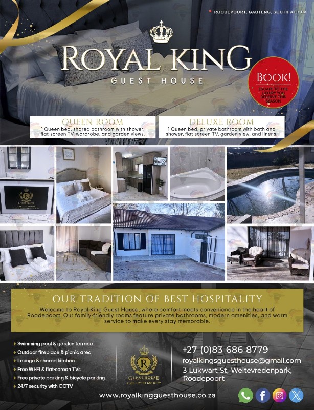 Book Guest House Hotel accommodation Near me roodepoort +27836868779 royal king guest house